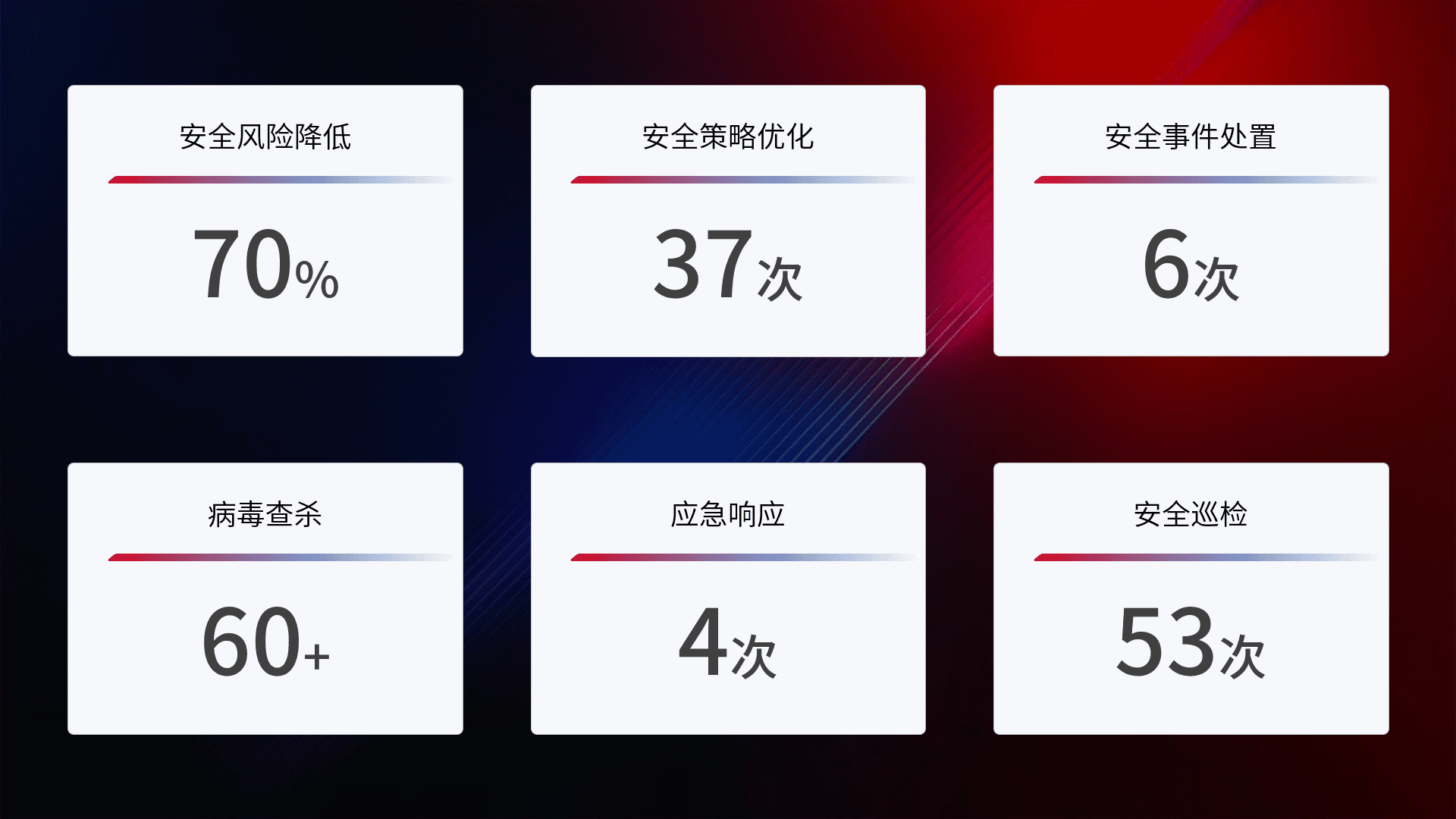 提供全面的安全事件报告体系,,包括处置报告、、、、周报、、季度和年度总结,,,结合持续监控,,,帮助客户深入了解网络安全状况。。。