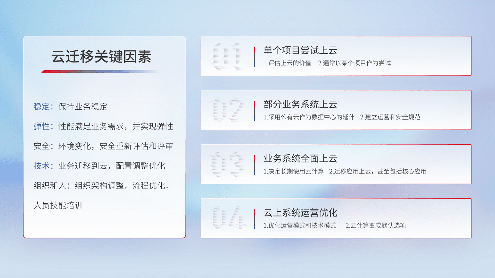 结合实际业务,,,,从规划设计、、、、云平台选型、、、、云原生改造、、数据迁移、、、集成交付,,迁移全过程为客户识别最佳上云路径,,做好风险识别管理,,,,设计网络架构、、、、身份权限、、、、安全审计合规、、、操作审计、、、、日志审计、、、、监控告警策略、、多站点容灾设计等,,,对云上基础设施进行整体规划,,,,提升IT治理水平,,,,以满足弹性、、、高可用、、、、高性能的需求。。